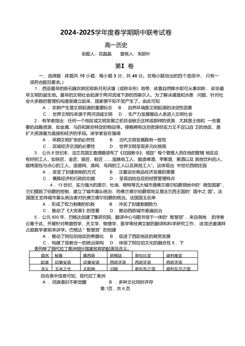 江苏省无锡市六校2024-2025学年下学期4月高一期中联考历史+答案