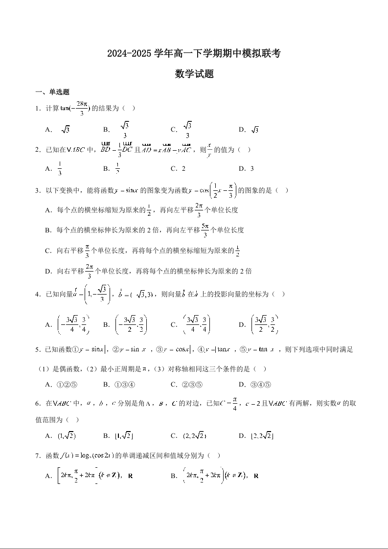 河南省南阳市十校联盟体2024-2025学年下学期高一期中联考数学+答案