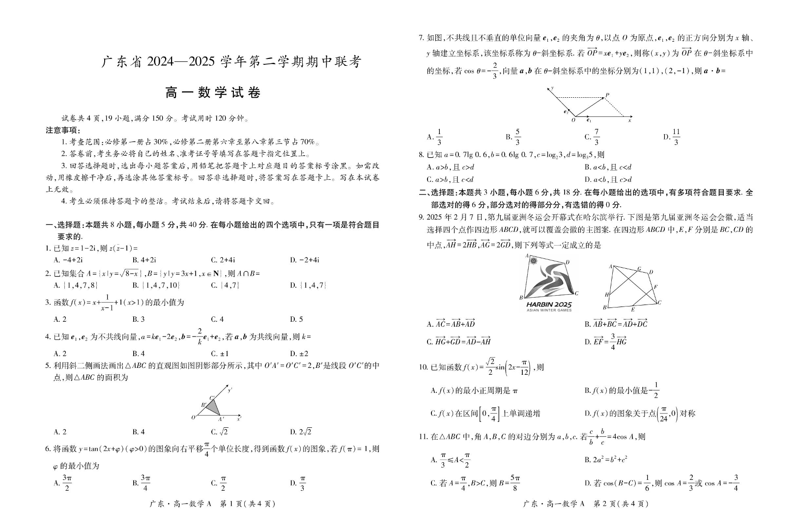 广东省区域高中2024-2025学年下学期4月高一期中联考数学+答案