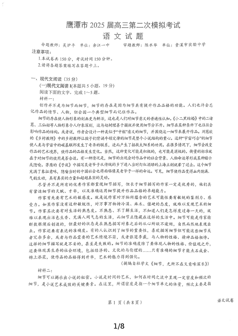 江西省鹰潭市2024-2025学年下学期4月高三二模考试语文+答案