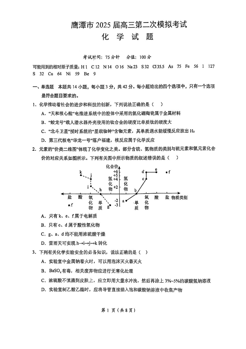 江西省鹰潭市2024-2025学年下学期4月高三二模考试化学+答案