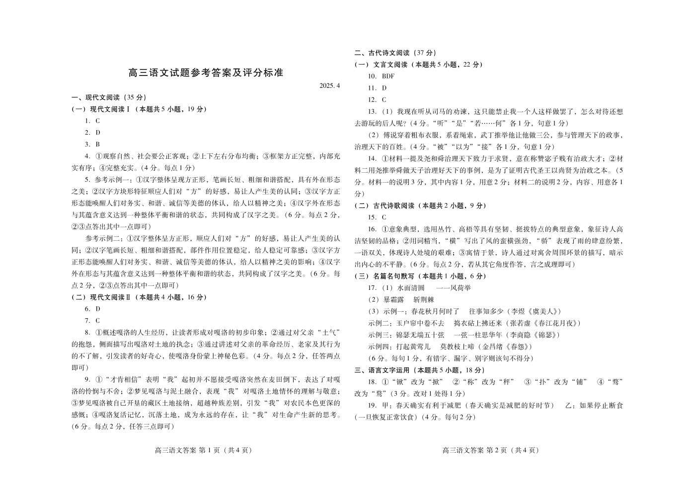 山东省潍坊市2024-2025学年下学期4月高三高考二模统考语文答案