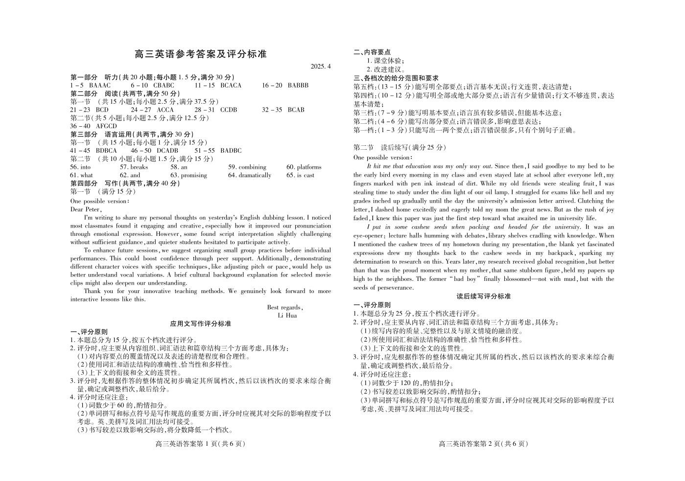 山东省潍坊市2024-2025学年下学期4月高三高考二模统考英语答案