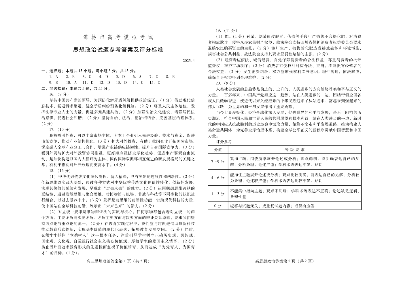 山东省潍坊市2024-2025学年下学期4月高三高考二模统考政治答案
