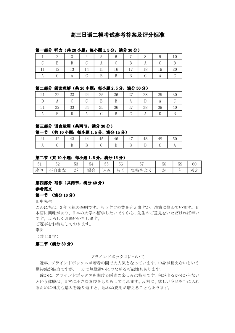 山东省潍坊市2024-2025学年下学期4月高三高考二模统考日语答案