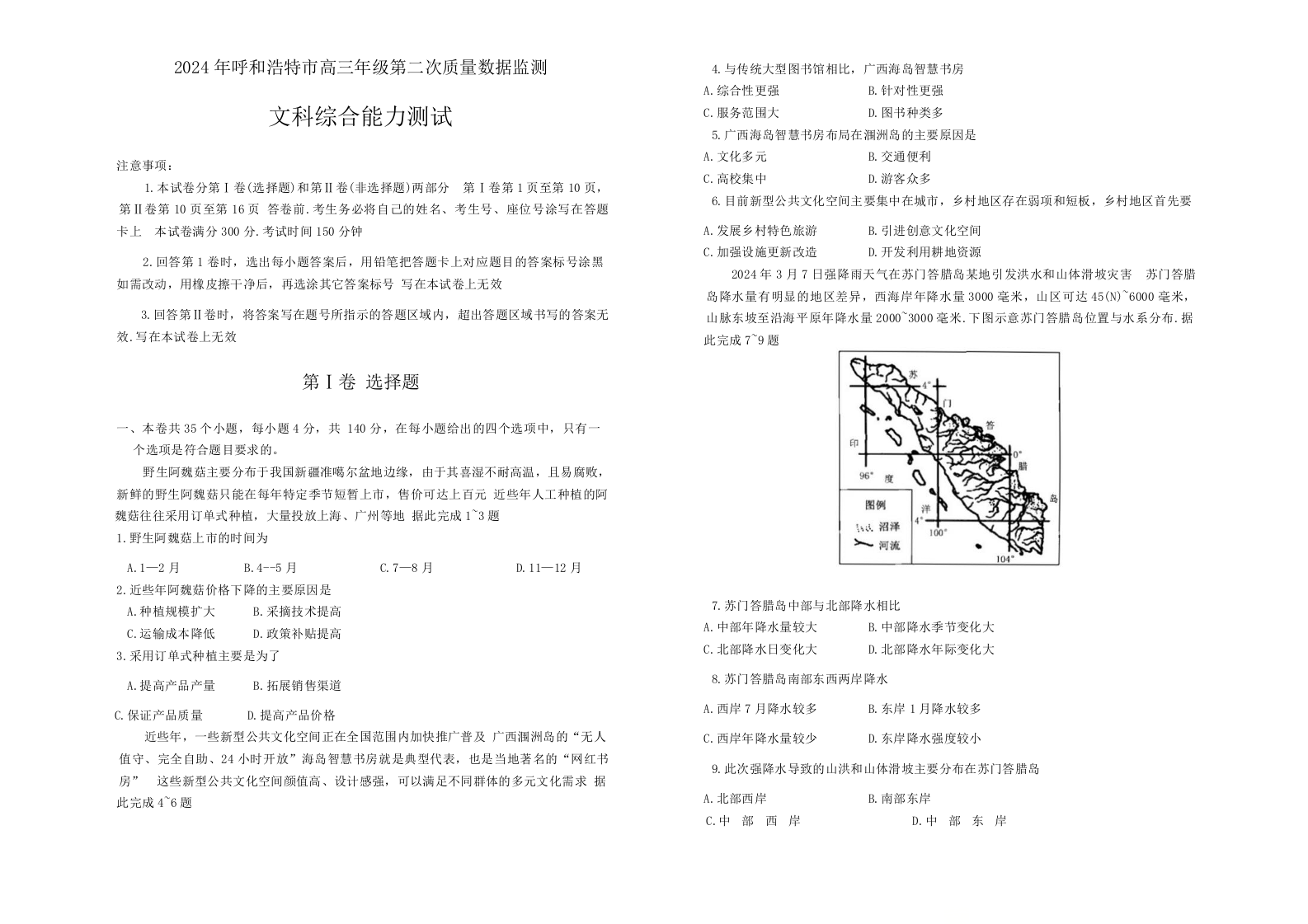 内蒙古呼和浩特市2024届高三年级第二次模拟检测文科综合