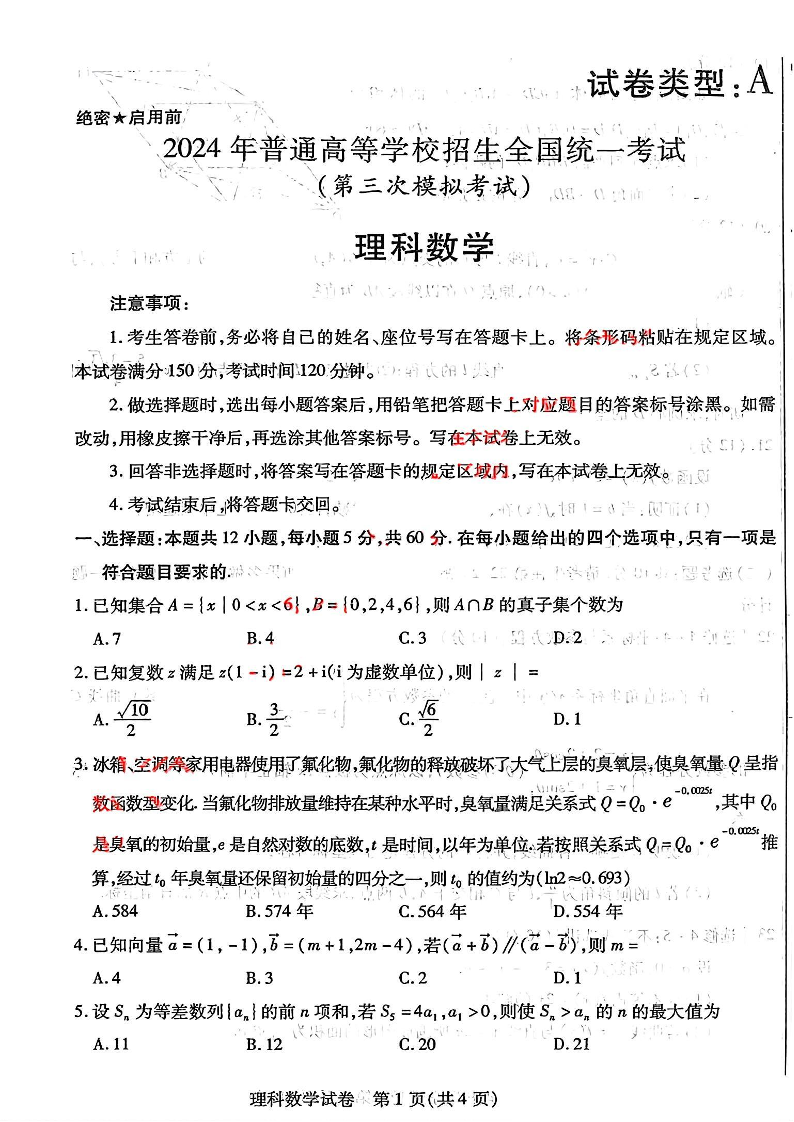 内蒙古自治区包头市2024届高三下学期三模理科数学+答案