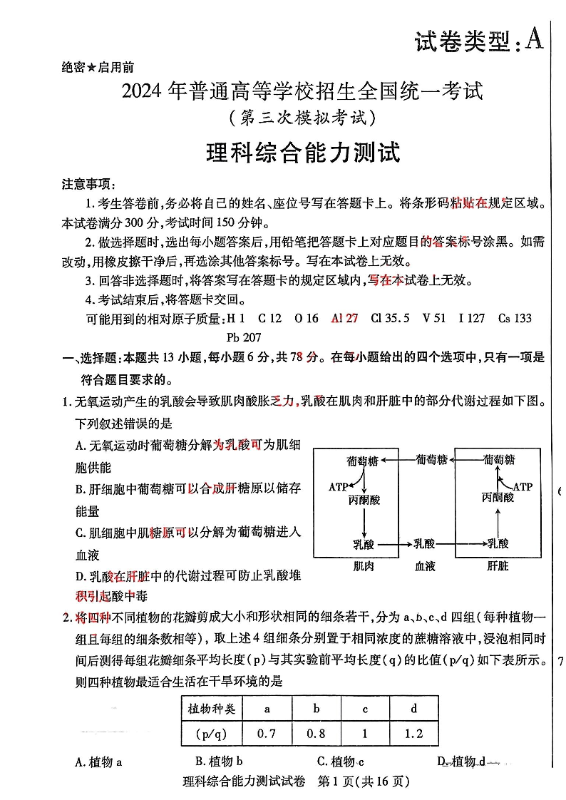 内蒙古自治区包头市2024届高三下学期三模理科综合