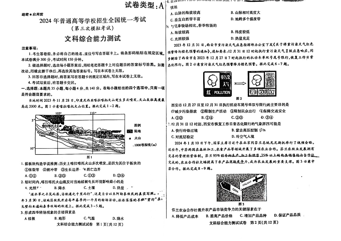 内蒙古自治区包头市2024届高三下学期三模文科综合+答案