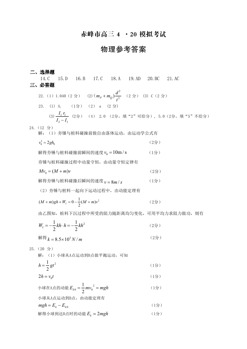 内蒙古自治区赤峰市2024届高三下学期420模拟考试物理答案