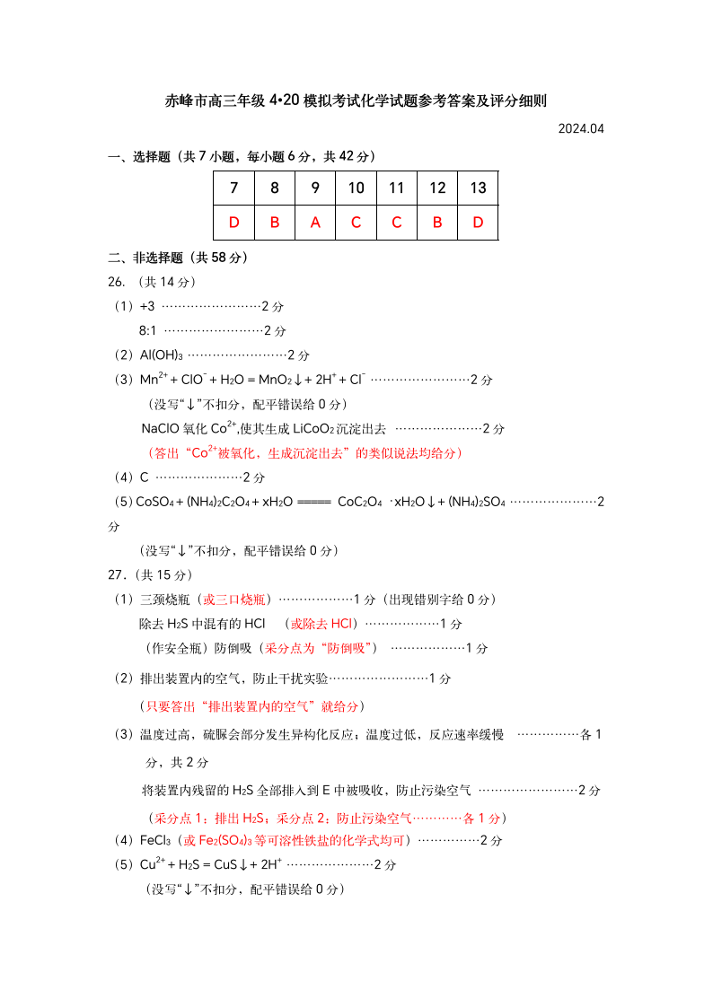 内蒙古自治区赤峰市2024届高三下学期420模拟考试化学答案