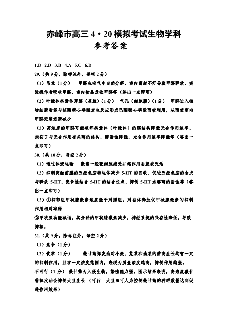 内蒙古自治区赤峰市2024届高三下学期420模拟考试生物答案