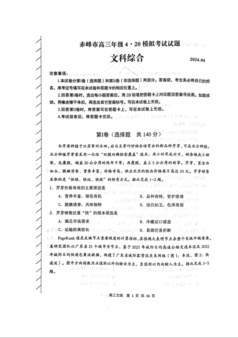 内蒙古自治区赤峰市2024届高三下学期420模拟考试文科综合