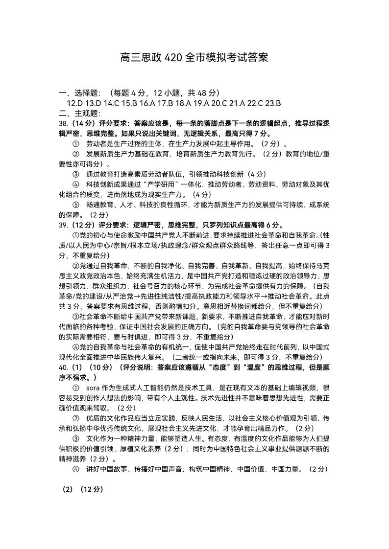 内蒙古自治区赤峰市2024届高三下学期420模拟考试政治答案