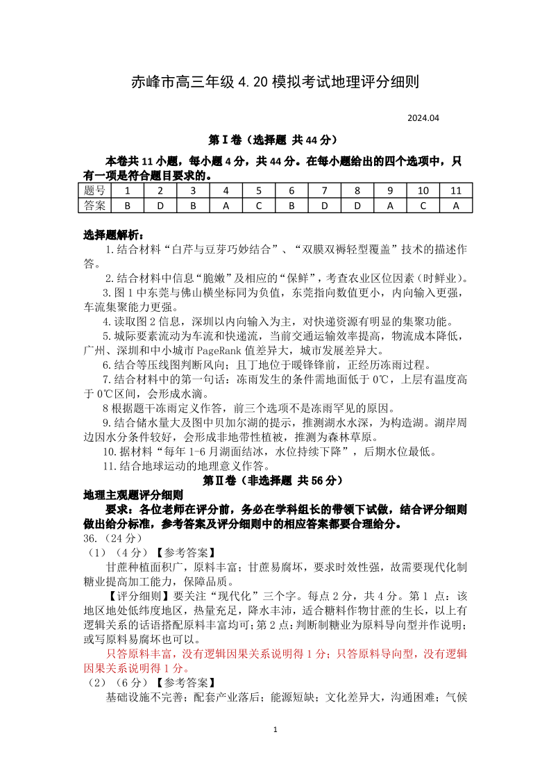 内蒙古自治区赤峰市2024届高三下学期420模拟考试地理答案