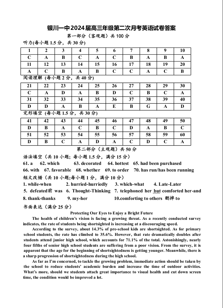 宁夏回族自治区银川一中2024届高三上学期第二次月考英语答案