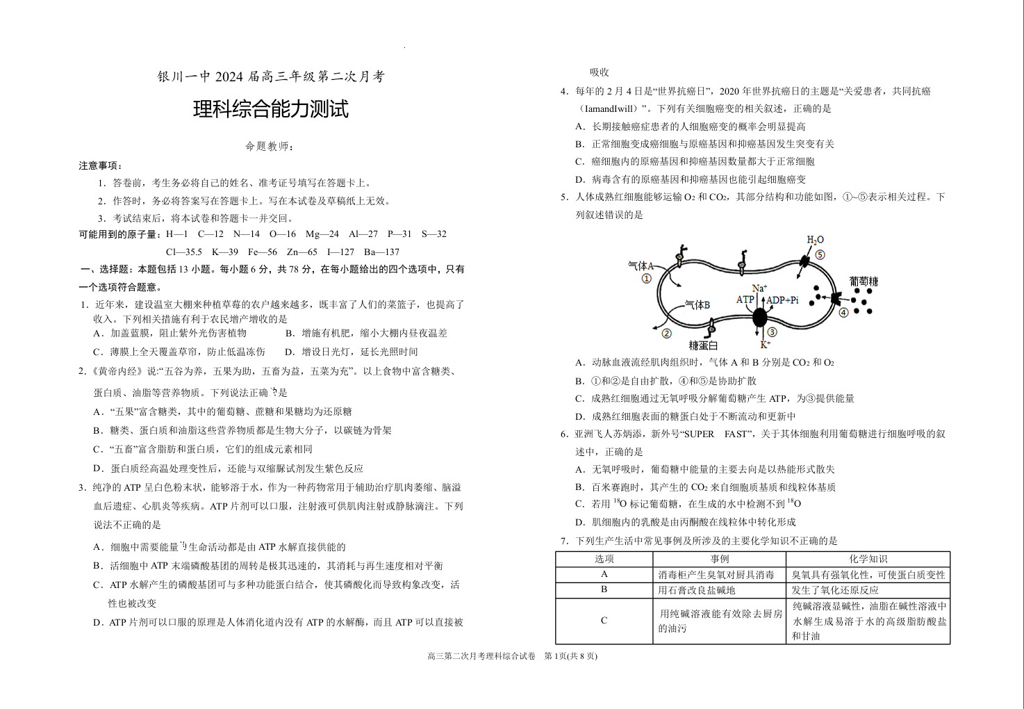 宁夏回族自治区银川一中2024届高三上学期第二次月考理科综合