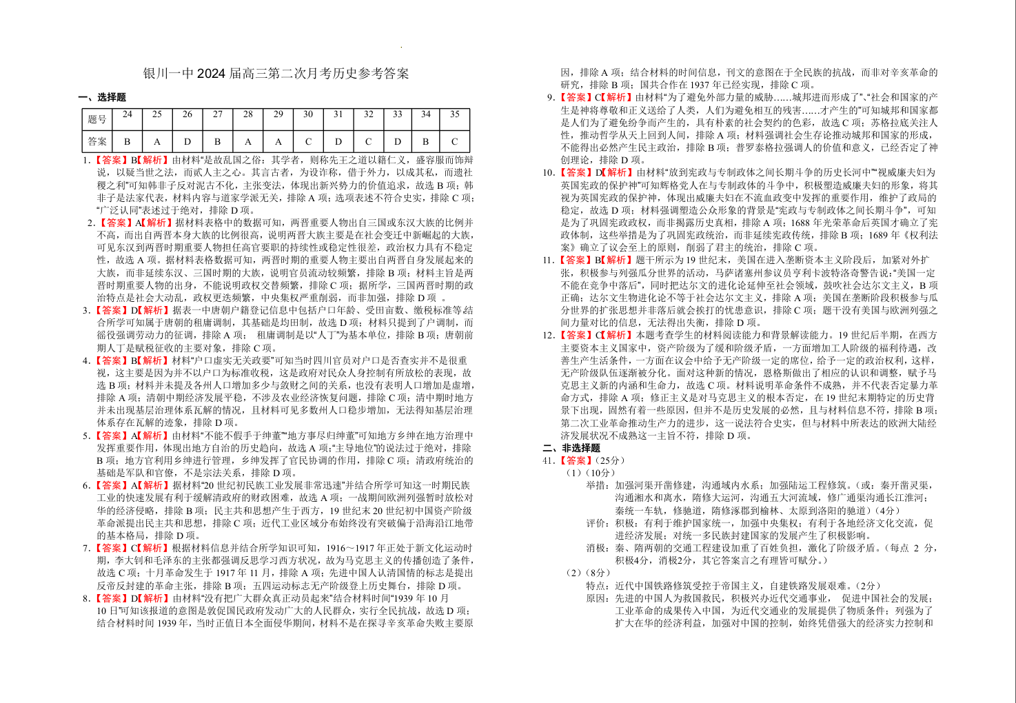 宁夏回族自治区银川一中2024届高三上学期第二次月考历史答案
