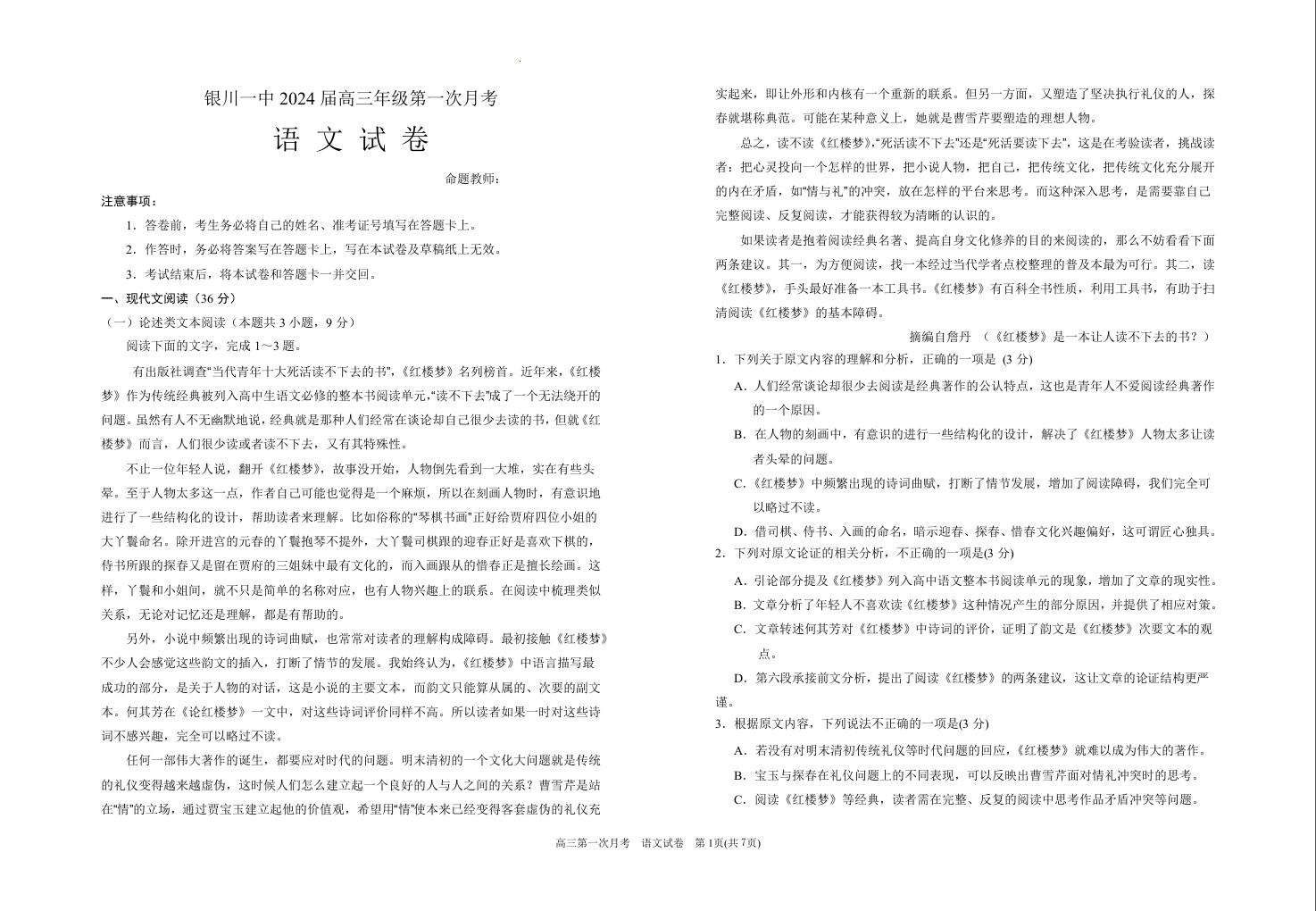 宁夏回族自治区银川一中2024届高三上学期第一次月考语文