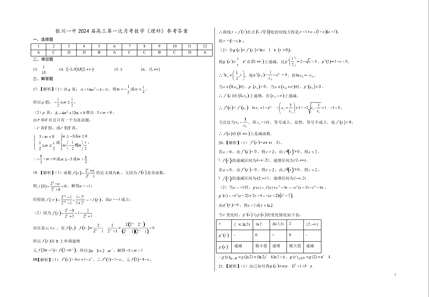 宁夏回族自治区银川一中2024届高三上学期第一次月考数学(理科)答案