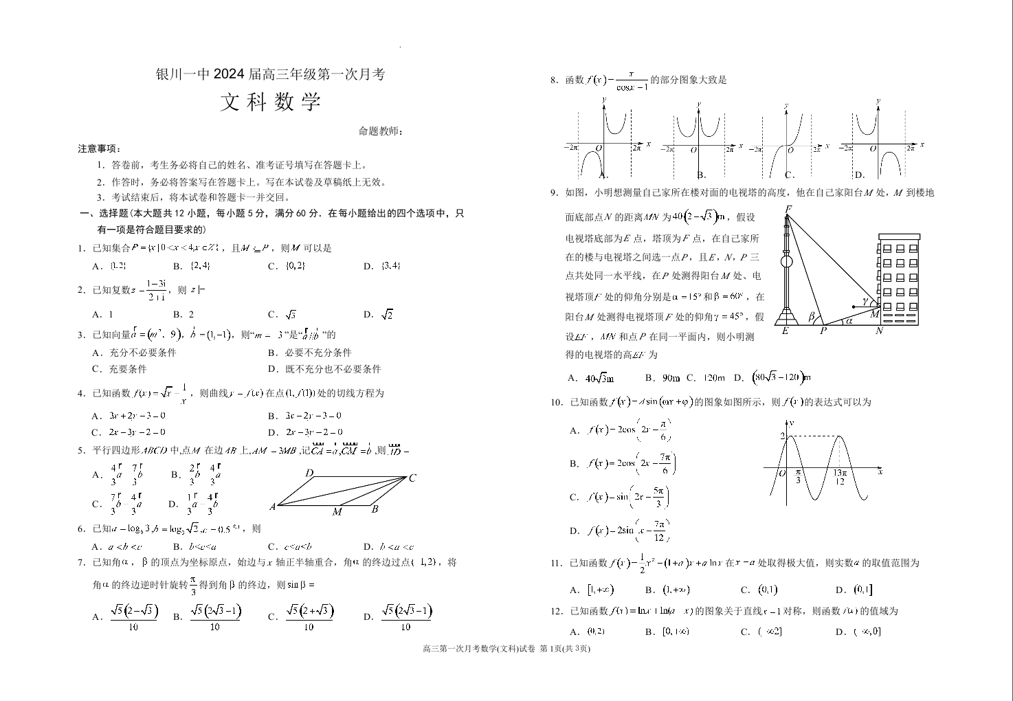 宁夏回族自治区银川一中2024届高三上学期第一次月考数学(文科)