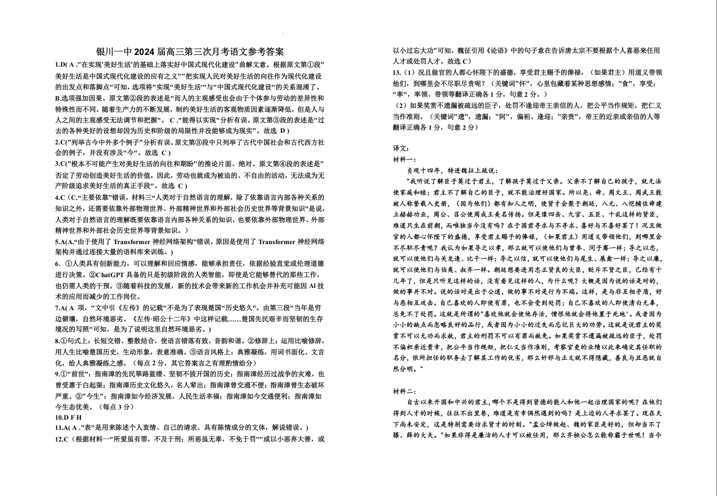 宁夏回族自治区银川一中2024届高三上学期第三次月考语文答案