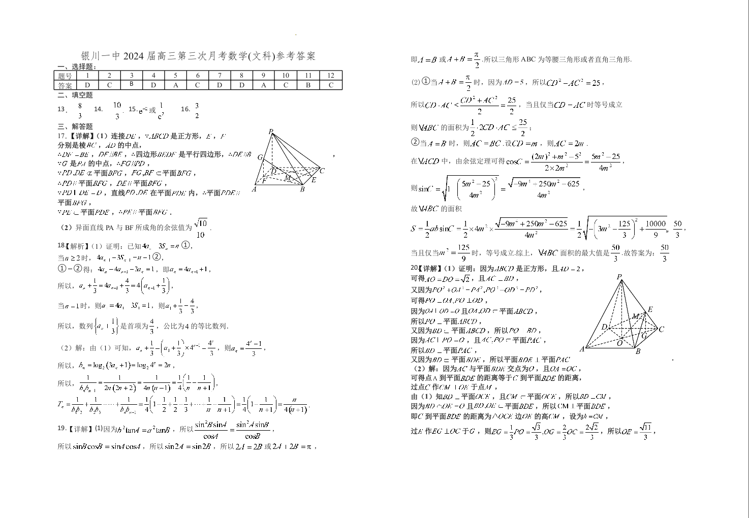 宁夏回族自治区银川一中2024届高三上学期第三次月考数学(文科)试卷