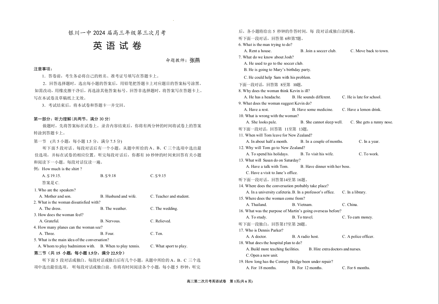 宁夏回族自治区银川一中2024届高三上学期第三次月考英语