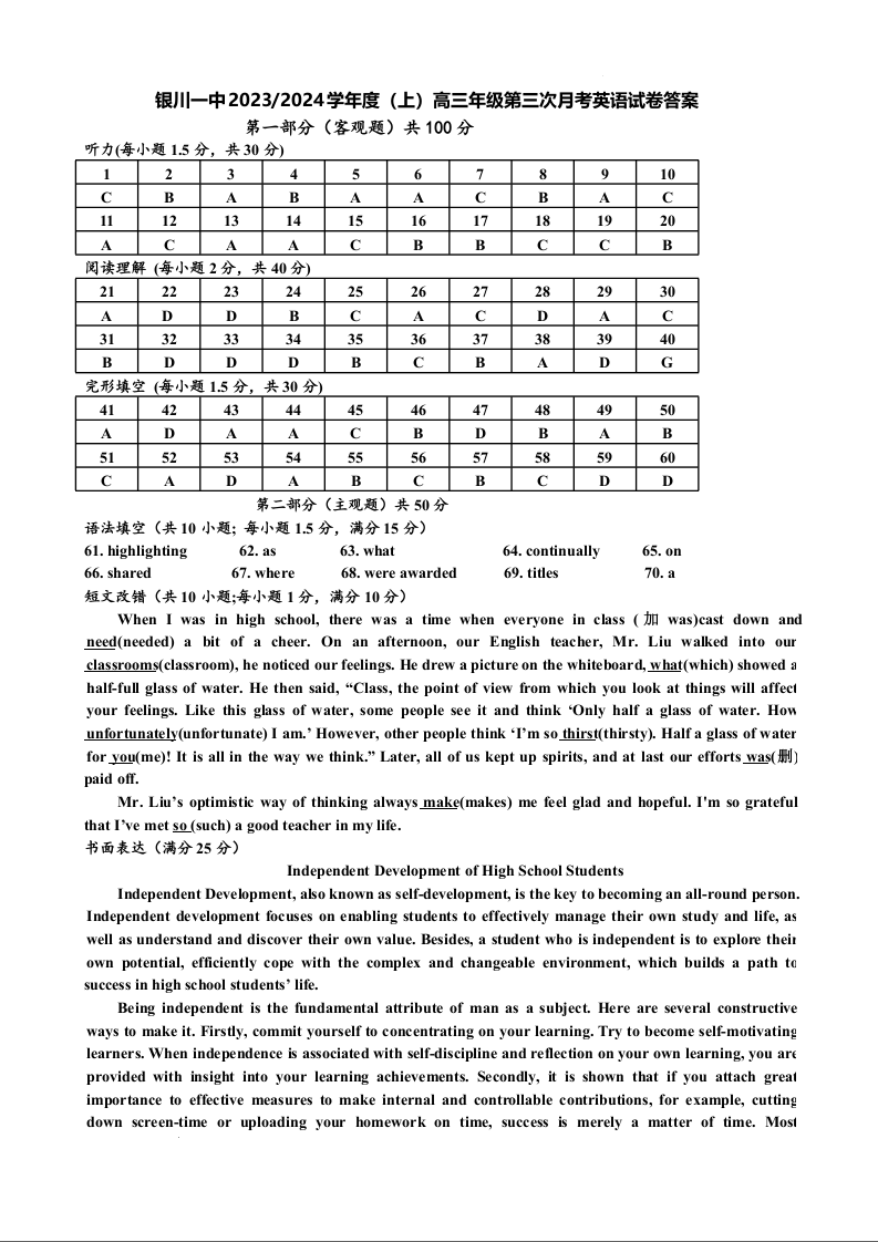 宁夏回族自治区银川一中2024届高三上学期第三次月考英语答案