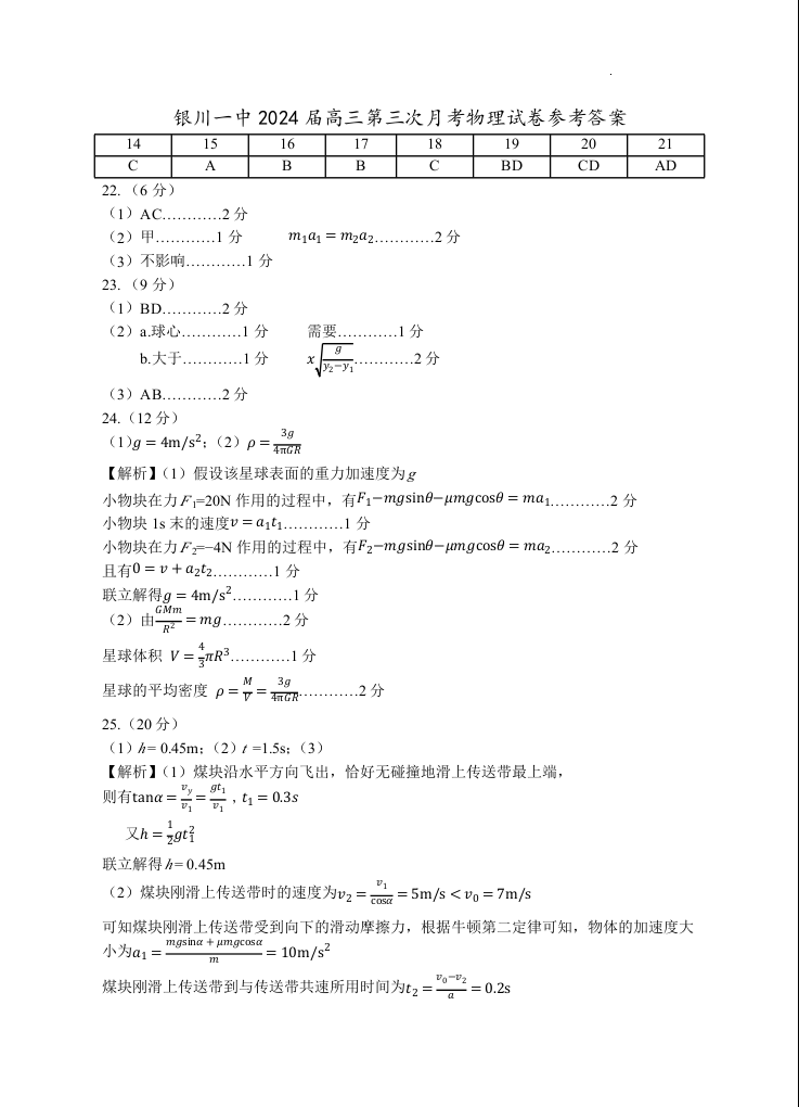 宁夏回族自治区银川一中2024届高三上学期第三次月考物理答案