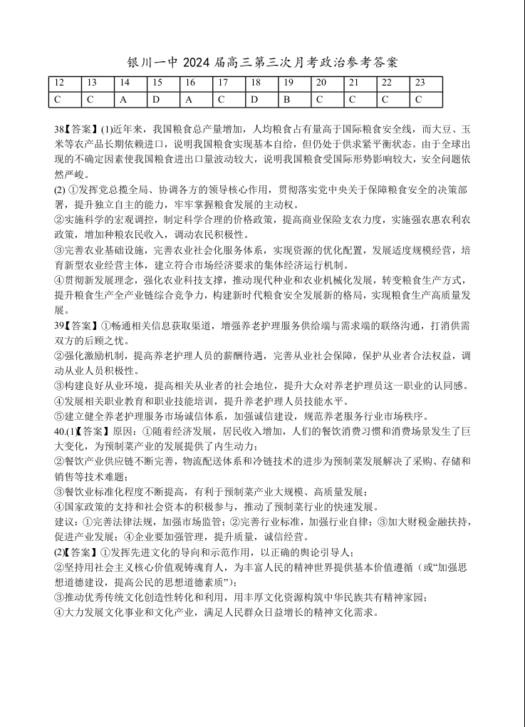 宁夏回族自治区银川一中2024届高三上学期第三次月考政治答案