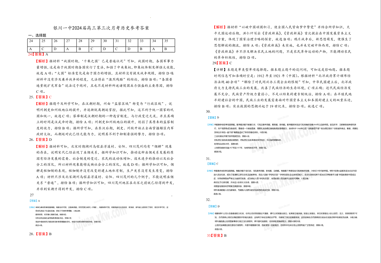 宁夏回族自治区银川一中2024届高三上学期第三次月考历史答案