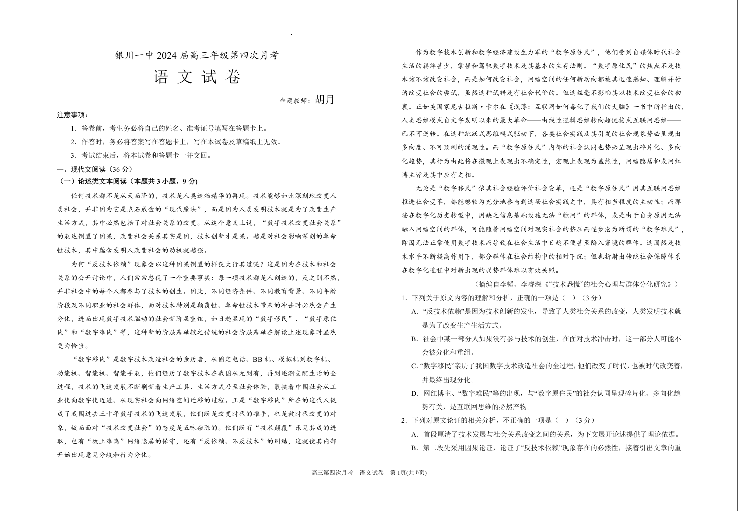 宁夏回族自治区银川一中2024届高三上学期第四次月考语文