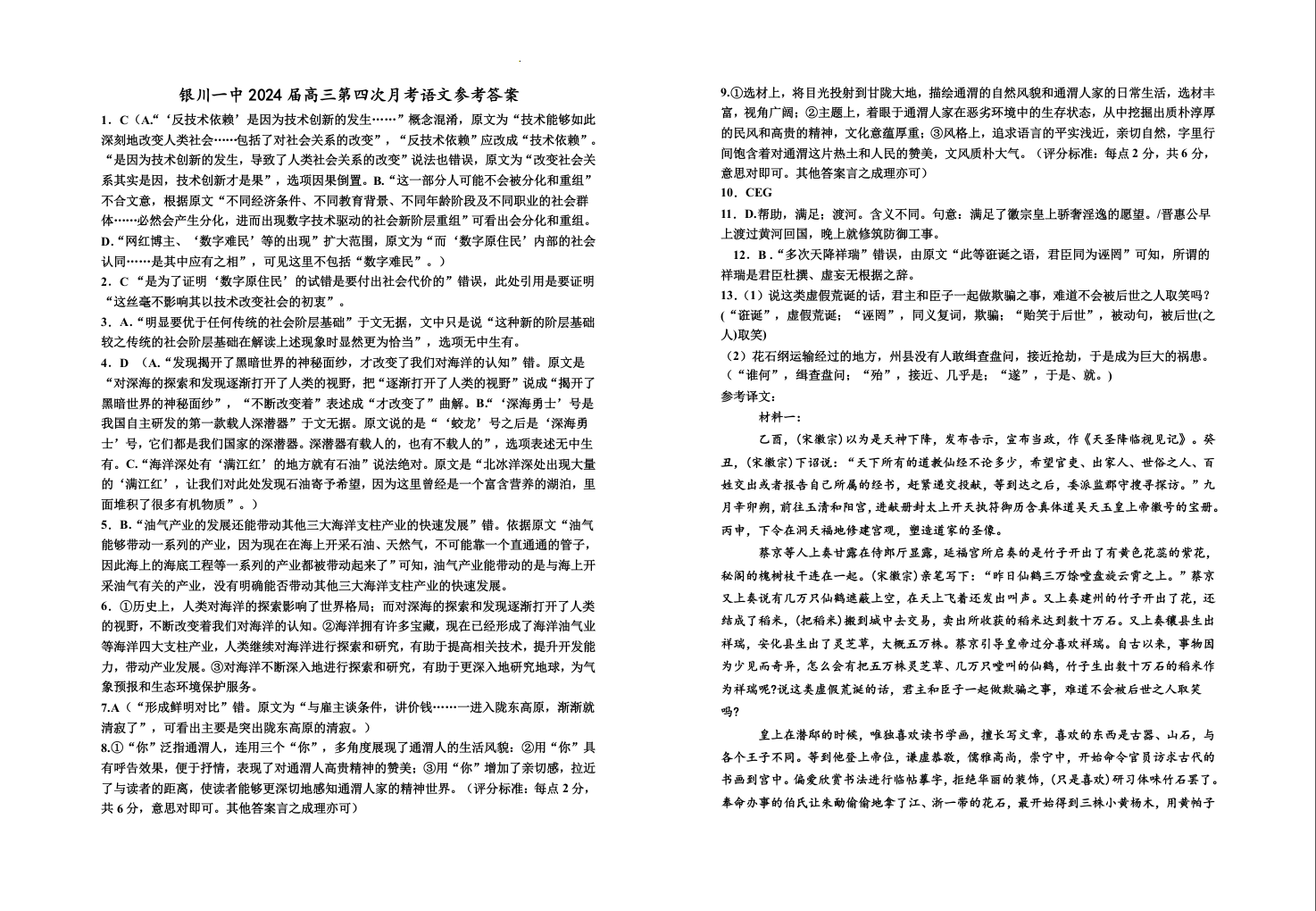 宁夏回族自治区银川一中2024届高三上学期第四次月考语文答案