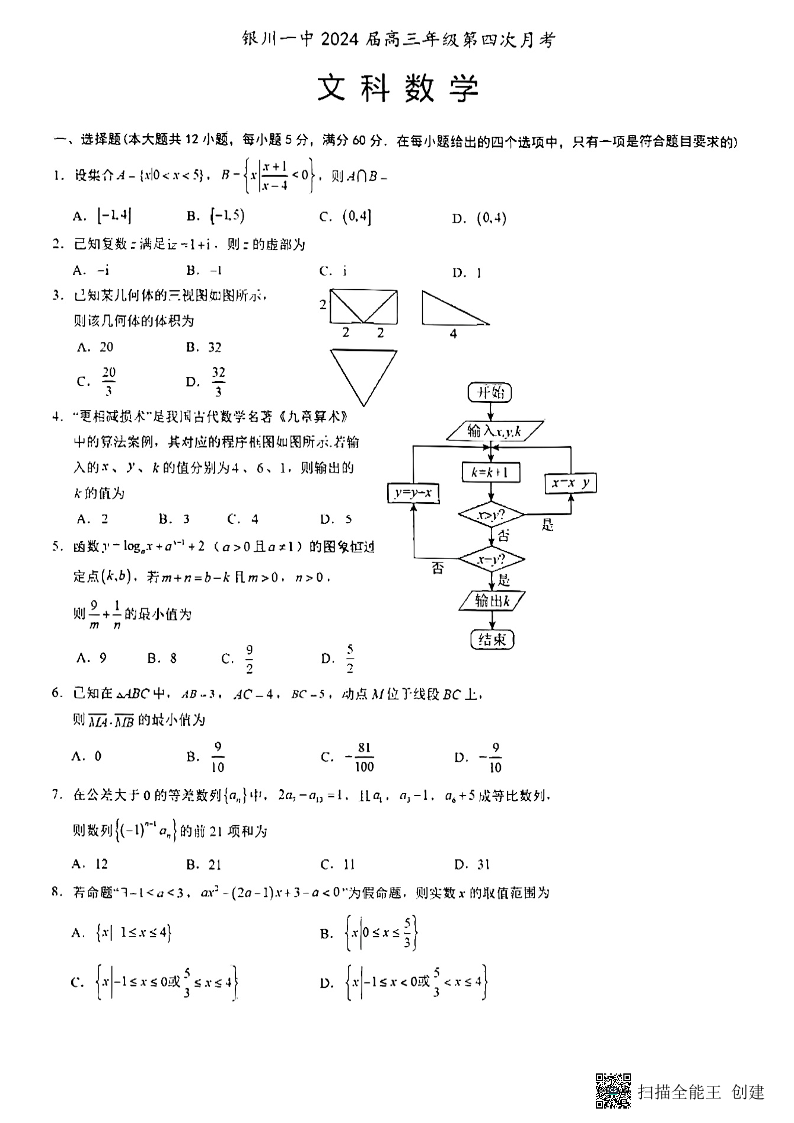 宁夏回族自治区银川一中2024届高三上学期第四次月考文科数学+答案