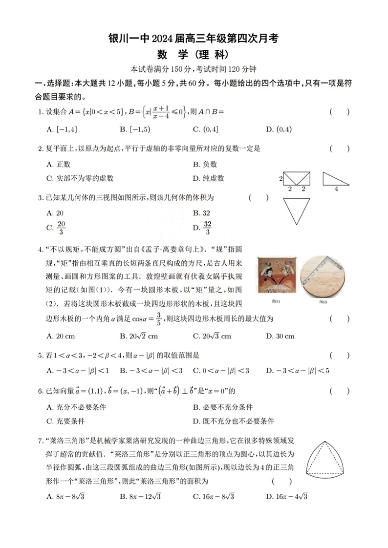 宁夏回族自治区银川一中2024届高三上学期第四次月考理科数学