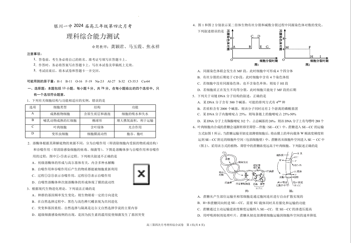 宁夏回族自治区银川一中2024届高三上学期第四次月考理科综合