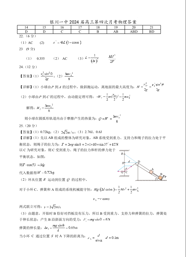 宁夏回族自治区银川一中2024届高三上学期第四次月考物理答案