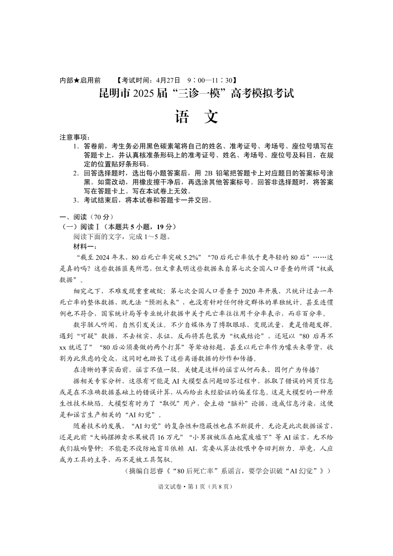 云南省昆明市2024-2025学年“三诊一模”4月高考模拟考试语文