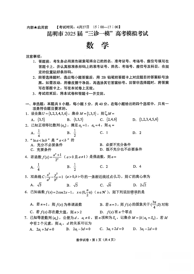 云南省昆明市2024-2025学年“三诊一模”4月高考模拟考试数学