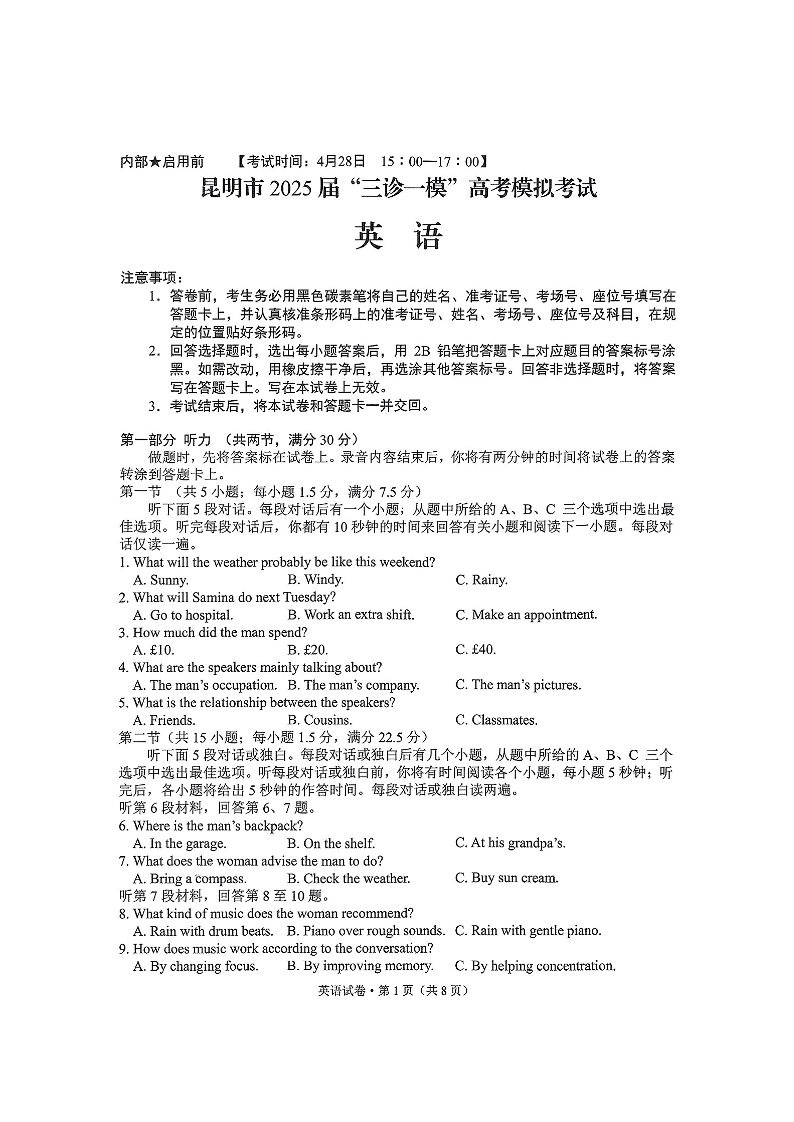 云南省昆明市2024-2025学年“三诊一模”4月高考模拟考试英语