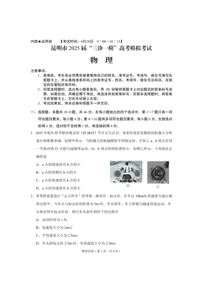 云南省昆明市2024-2025学年“三诊一模”4月高考模拟考试物理