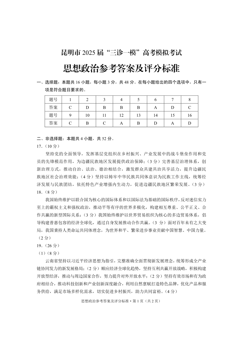 云南省昆明市2024-2025学年“三诊一模”4月高考模拟考试政治答案