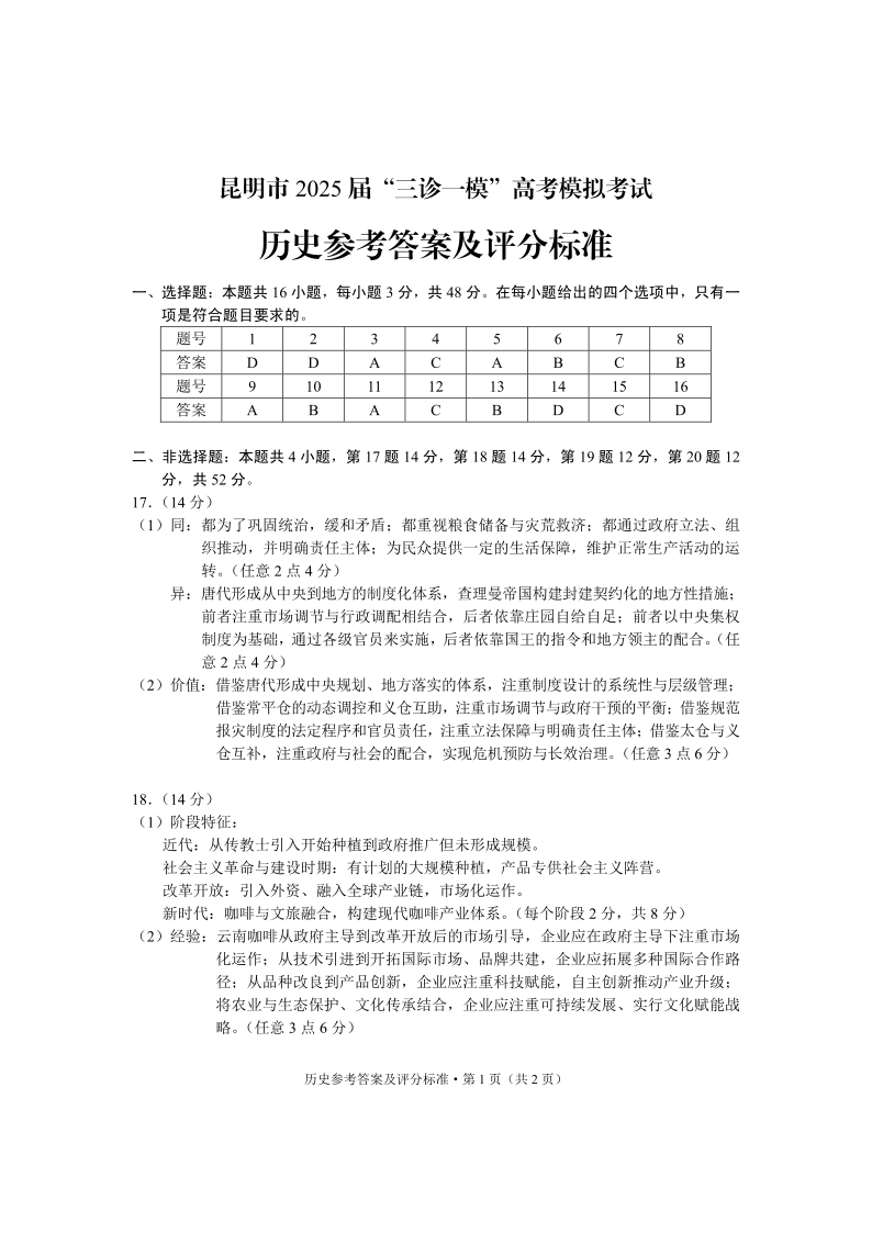 云南省昆明市2024-2025学年“三诊一模”4月高考模拟考试历史答案