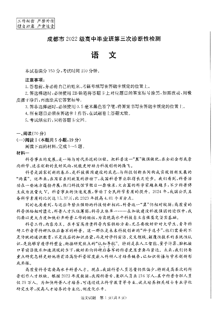 四川省成都市2024-2025学年下学期高三第三次诊断性检测语文