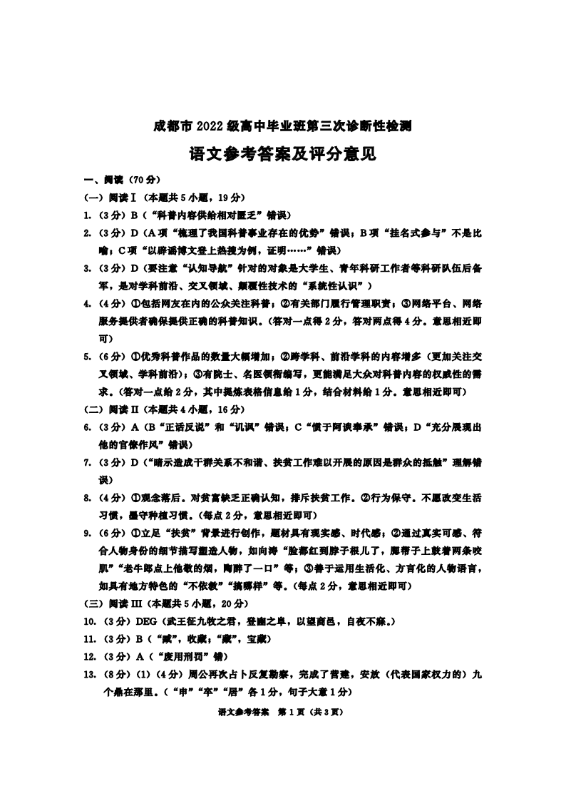 四川省成都市2024-2025学年下学期高三第三次诊断性检测语文答案