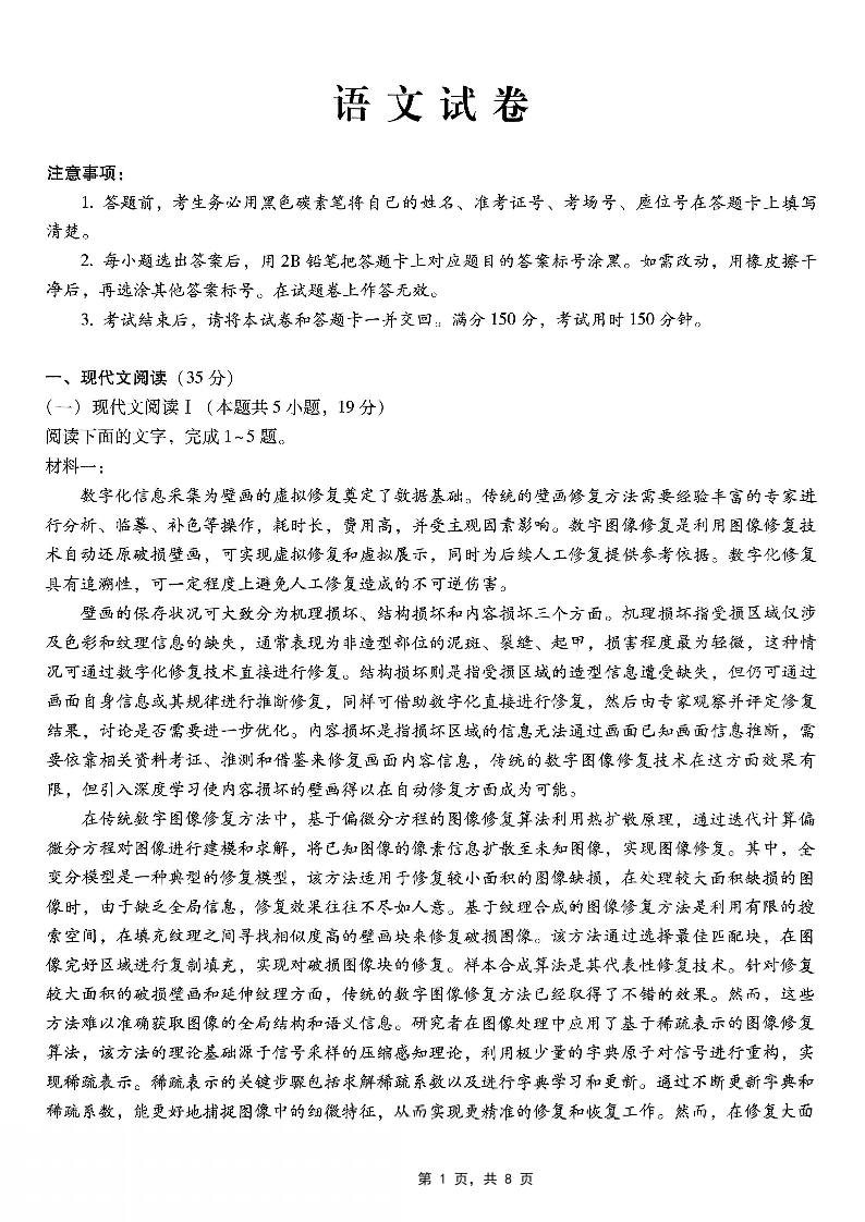 重庆市巴蜀中学2024-2025学年高三高考适应性月考(八)语文