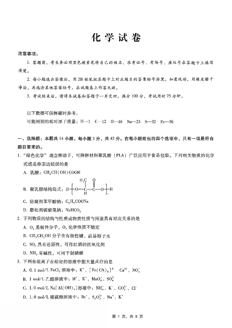 重庆市巴蜀中学2024-2025学年高三高考适应性月考(八)化学