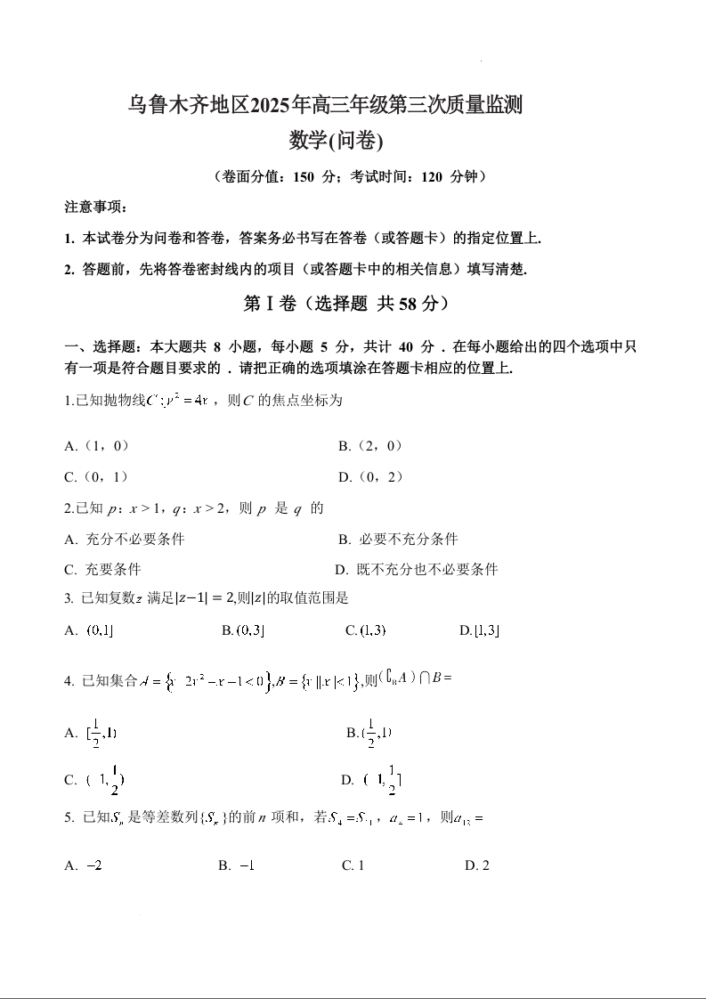 新疆乌鲁木齐地区2024-2025学年高三三模质量监测数学