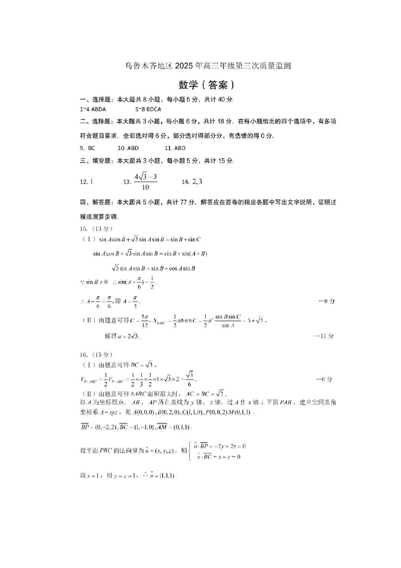 新疆乌鲁木齐地区2024-2025学年高三三模质量监测数学答案